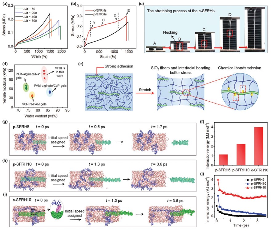 二氧化硅納米纖維的高長徑比和納米纖維與水凝膠網絡之間穩定的界面結合,都有助于SFRHs具有優異的力學性能。研究團隊首先制備了不含硅烷的硅納米纖維增強水凝膠,界面上只存在物理鍵合,將此水凝膠記為p-SFRHs。當硅納米纖維的長徑比從50增加到400時,其力學強度有較大提高(從0.11 MPa增加到0.24 MPa),這可能與界面強度的提高有關。